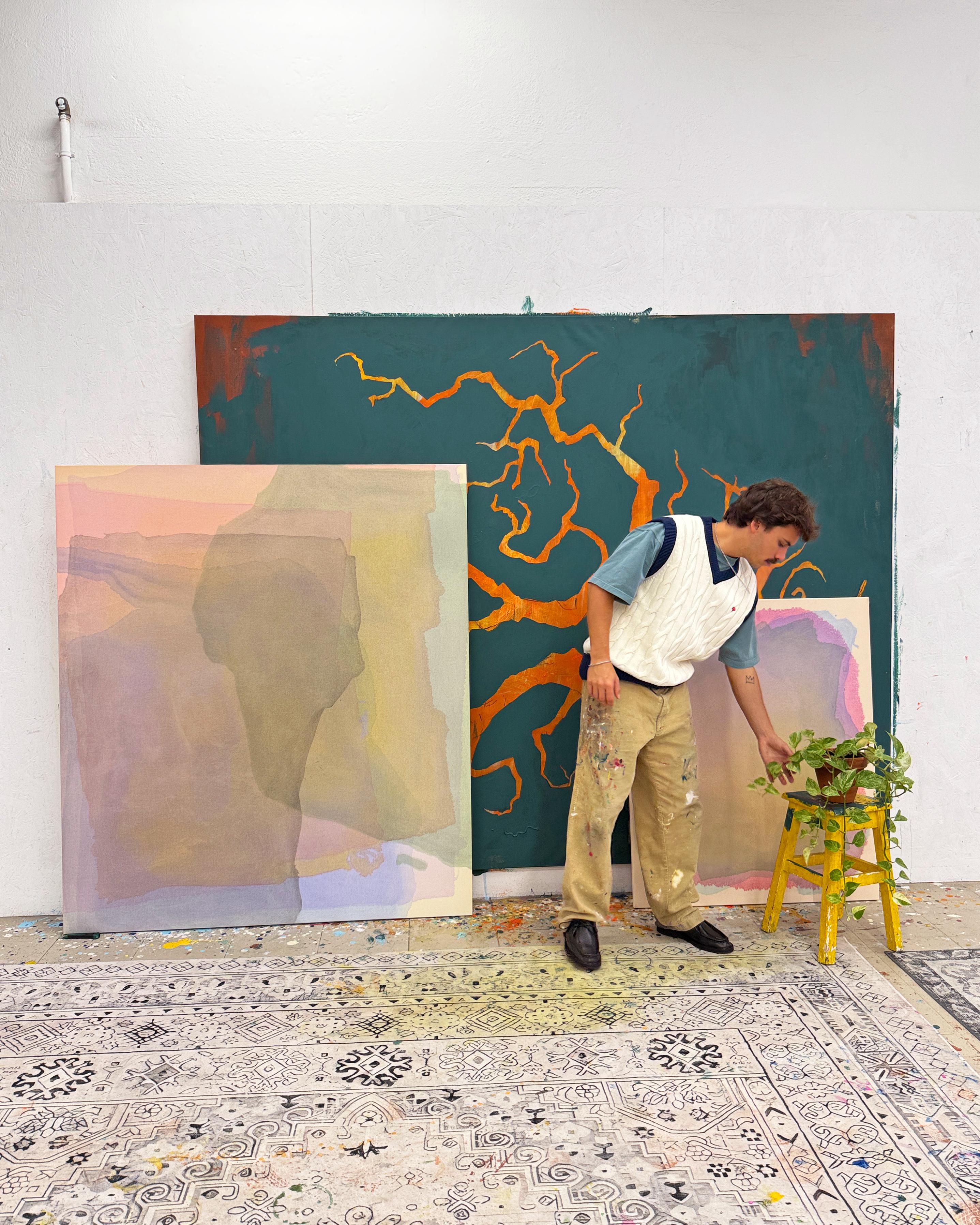 An abstract artist driven by intuition, experimentation and movement, his work is less about representation and more about energy. Shapes collide, colors stretch, gestures overlap. Nothing feels accidental, even when it starts that way.